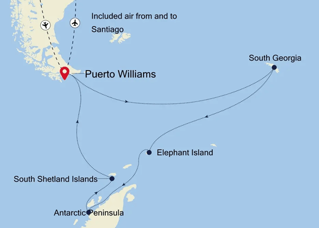 - Expeditions embarking in Puerto Williams include one pre-cruise hotel night stay in Santiago.