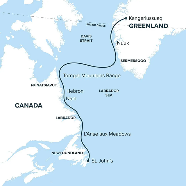ON, Canada to Kangerlussuaq, Greenland. Early-morning departure.
