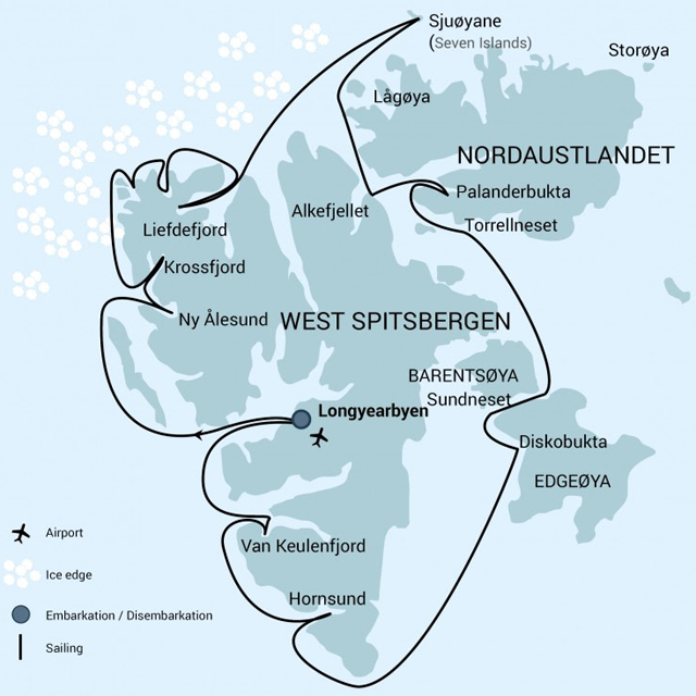 Spitsbergen route if ice prevents entry into Hinlopen. After cruising