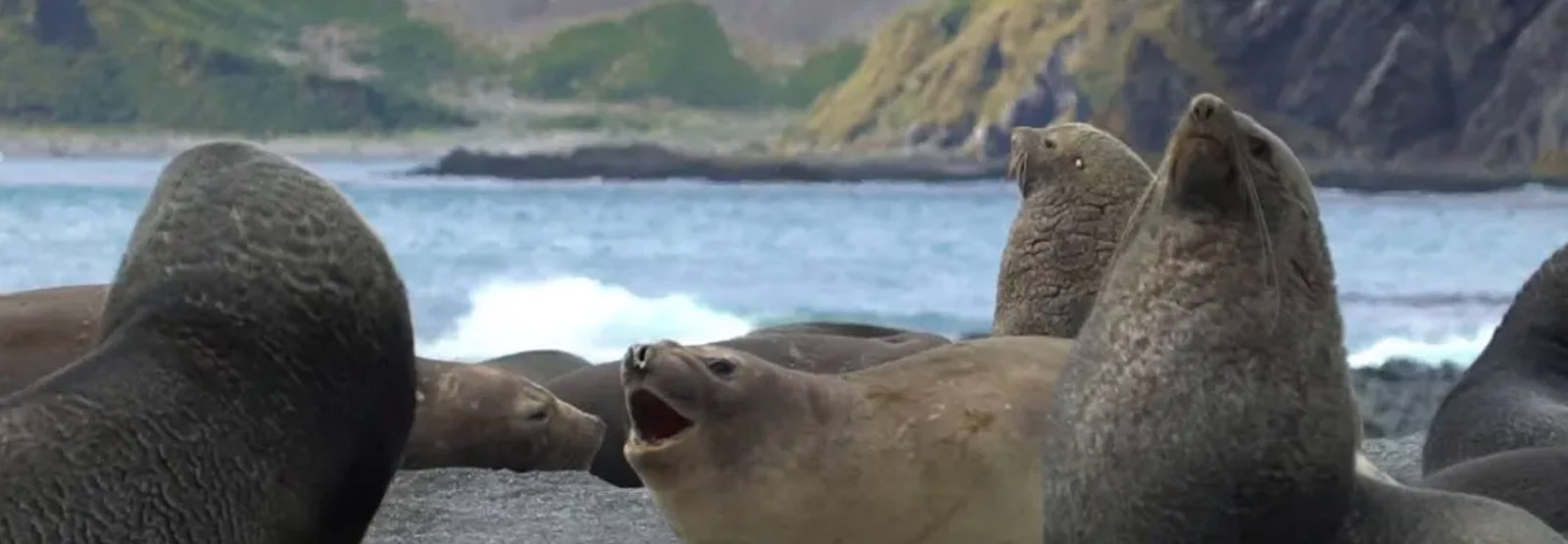 dominated by hundreds of fur or elephant seals. The grasses, mountains