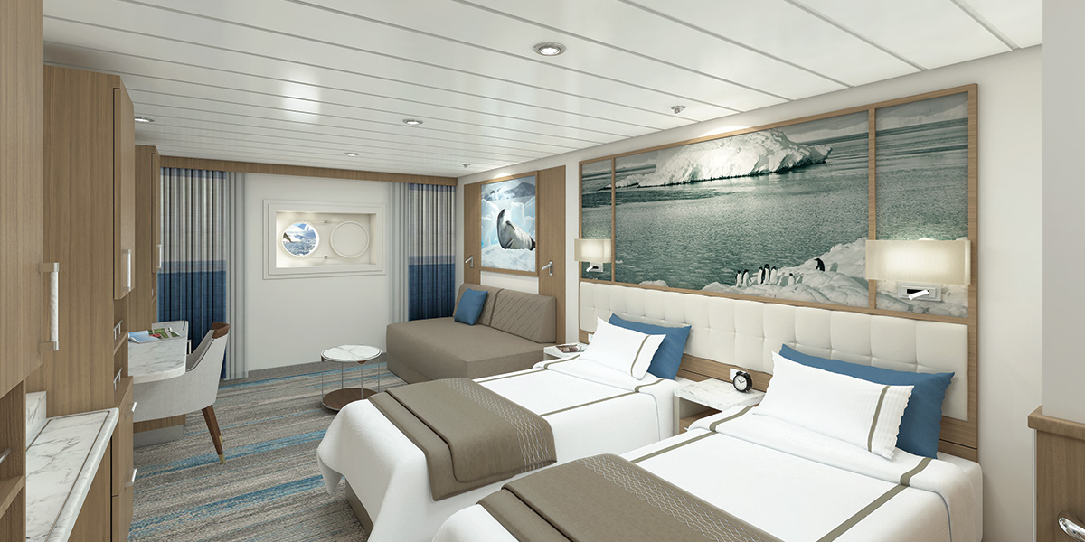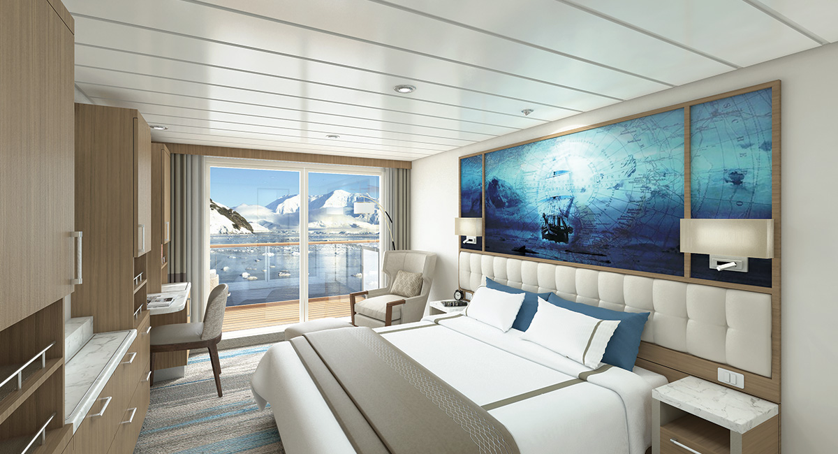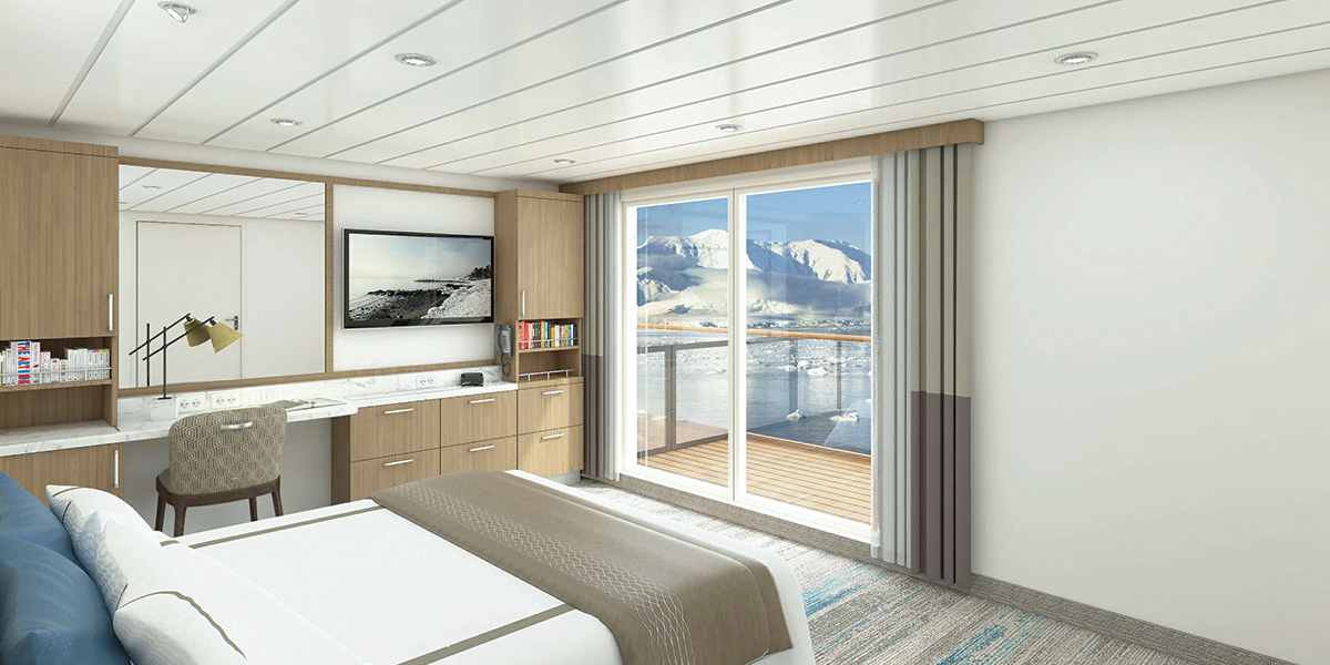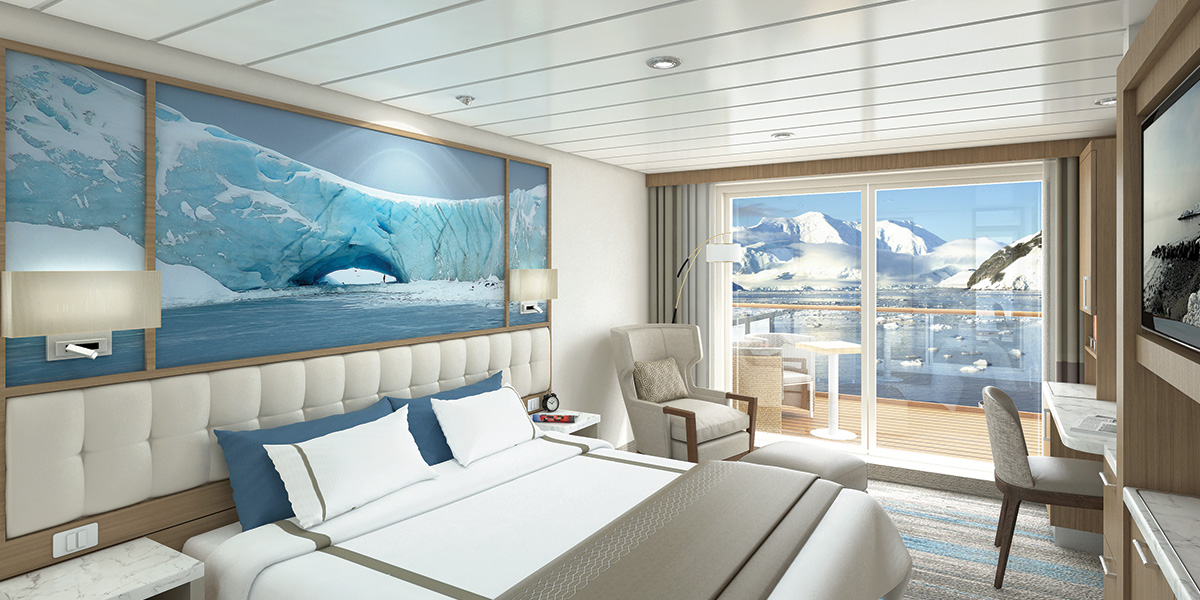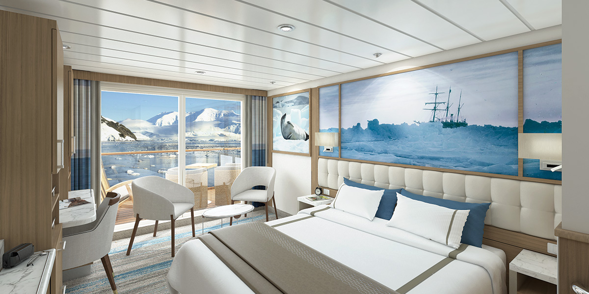 The largest of all our rooms, the Greg Mortimer's singular Captain's Suite will take you to the polar regions in ultimate style and comfort. Complete with large lounge area, balcony, walk-in wardrobe and en-suite, you'll need to get in early to secure this suite.