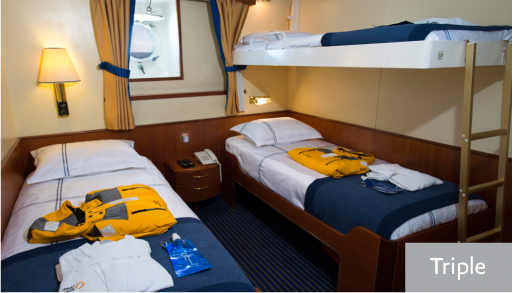 Averaging 128 sq. ft. (12 sq. m), a Triple Cabin is equipped with two lower berths and one upper berth. Located on the Main Deck, it has private facilities, and a porthole with exterior views.