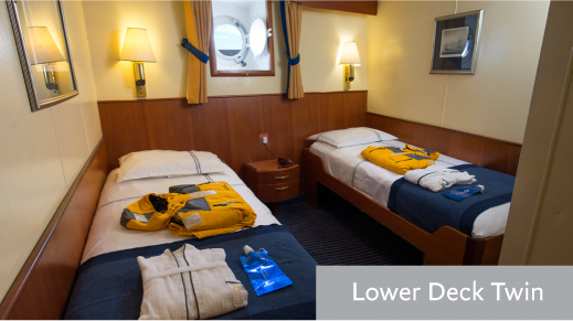 Averaging 133 sq. ft. (12 sq. m), a Lower Deck Twin Cabin is equipped with two lower berths. Located on the Lower Deck, it has private facilities, and a porthole with exterior views.
