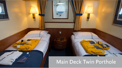 Averaging 118 sq. ft. (11 sq. m), a Main Deck Twin Porthole Cabin is equipped with two lower berths. Located on the Main Deck, it has private facilities, and a porthole with exterior views.