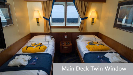 Averaging 139 sq. ft. (13 sq. m), a Main Deck Twin Window Cabin is equipped with two lower berths. Located on the Main Deck, it has private facilities, and two windows with exterior views.