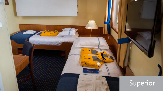 Averaging 142 sq. ft. (13 sq. m), a Superior Cabin is equipped with two lower berths. Located on the Upper Deck, it has private facilities, and windows with exterior views.