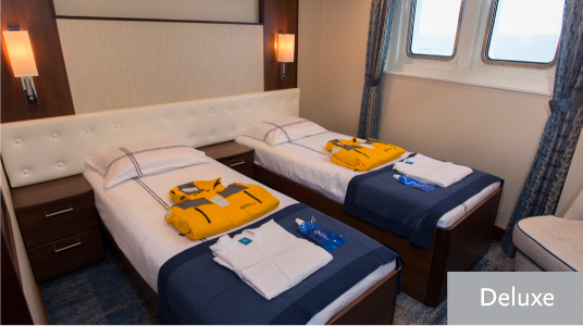 Averaging 150 sq. ft. (14 sq. m), a Deluxe Cabin is equipped with two lower berths. Located on the Upper and Captain’s Decks, it has private facilities, and windows with exterior views.