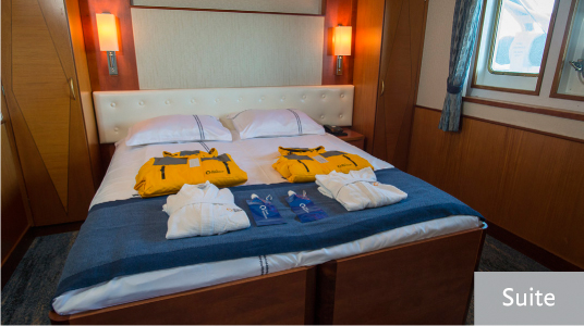 Averaging 215 sq. ft. (20 sq. m), a Suite is equipped with one double bed made up of two twin berths. Located on the Captain’s Deck, it has windows with exterior views and private facilities. Cabin 403 has a bathtub; other Suites have shower stalls.