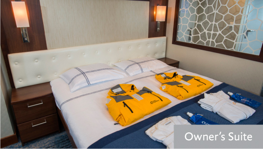 Averaging approximately 244 sq. ft. (22 sq. m), an Owner’s Suite Cabin is equipped with one double bed made up of two twin berths. Located on the Bridge Deck, it has private facilities, and windows with exterior views.