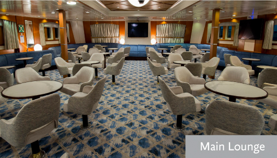 Our theater-style auditorium in the Main Lounge on the Upper Deck can accommodate everyone onboard, so it serves as our main lecture hall where presentations and movies are provided for your education and enjoyment. You can also grab a cup of complimentary coffee or tea.