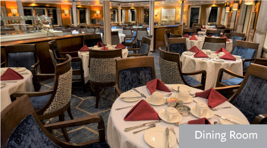 There is one dining room located on the Upper Deck. If there is one constant at sea, it is that you’ll enjoy delicious meals on a daily basis. While meal times may change due to landings and wildlife encounters, you’ll always be served three meals a day. Hours of operation will be posted around the ship, and are subject to change based on the activities planned for each day.