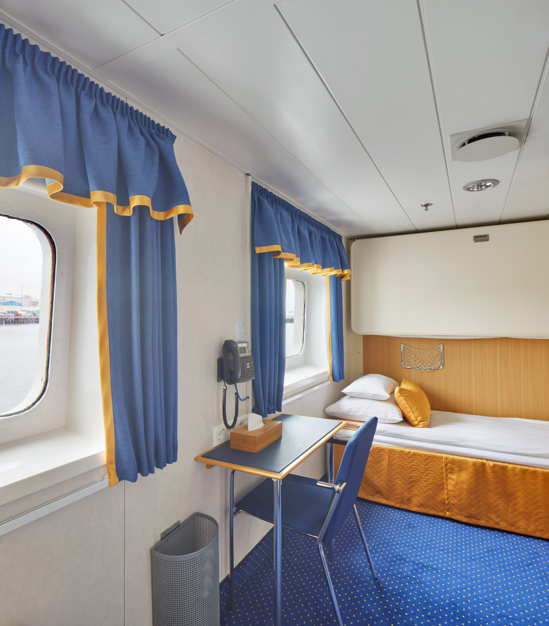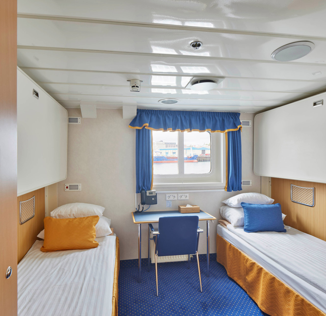 For our air-cruises, Ocean Nova has capacity for 67 passengers accommodated in comfortable outside cabins. The ship offers three categories of accommodation: dedicated Single Cabins, Twin Cabins, and Triple Cabins. All cabins feature a picture window, a writing desk with chair, a wardrobe, individually controlled heating system, and a private bathroom with shower.