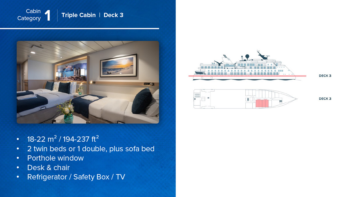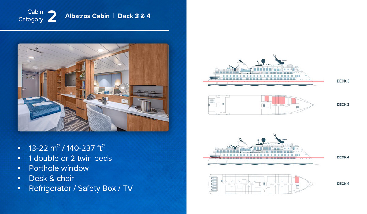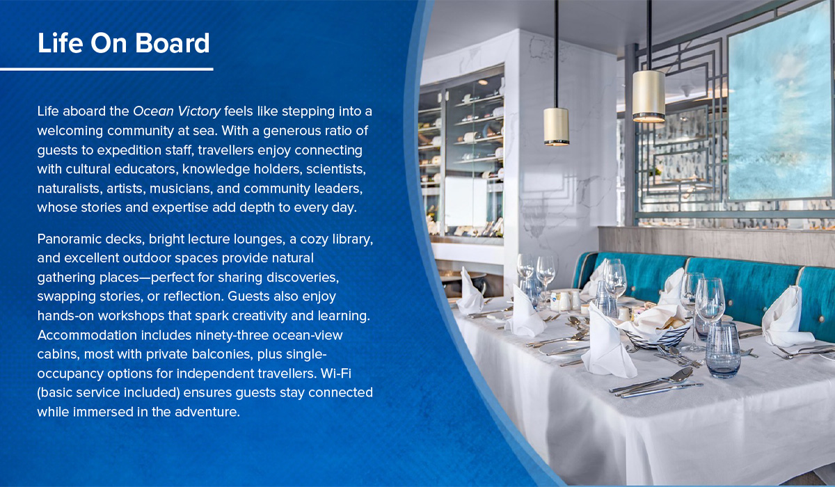 On board, travellers are welcomed into bright cabins, panoramic decks, and inviting spaces designed to spark conversation, laughter, and learning. Shared meals, engaging presentations, and quiet moments of reflection as icebergs drift past create a sense of community and curiosity. The Ocean Victory offers a rare combination of comfort, connection, and environmental care.
