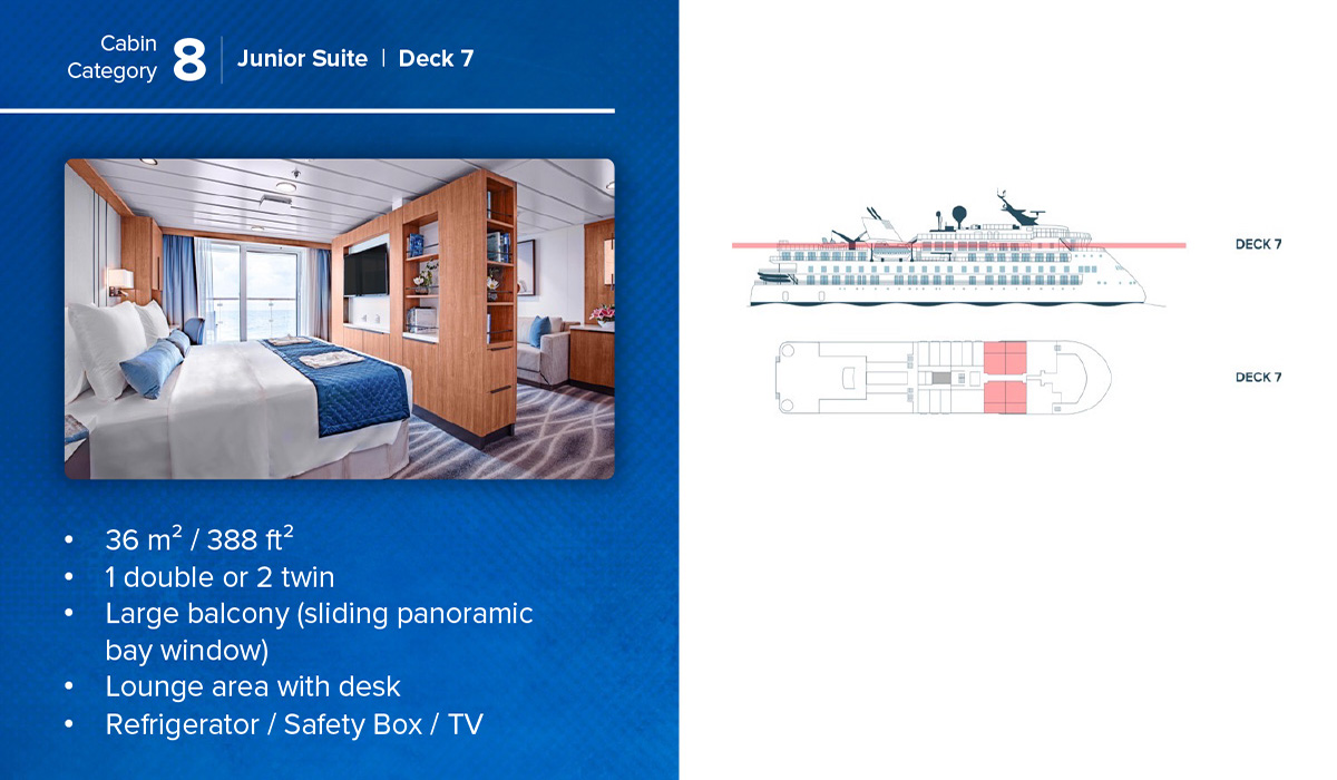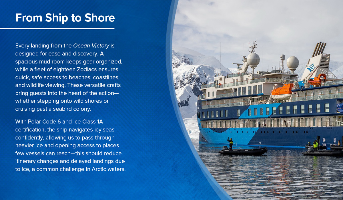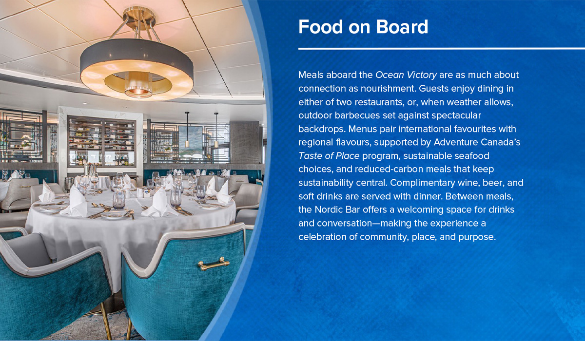 The Ocean Victory, launched in 2021, is one of the most modern small expedition vessels at sea. Purpose-built for discovery, it combines comfort, capability, and a deep commitment to sustainability—an ideal platform for Adventure Canada’s small-ship journeys to some of the world’s most remarkable places. Its innovative X-BOW® hull delivers smoother, quieter crossings and greater stability, while its ice-strengthened design ensures safe passage into areas few ships can reach.