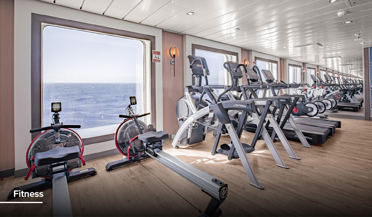 Stay active at sea with cardio equipment and weight machines. Floor-to-ceiling windows provide inspiring ocean views, turning every workout into a refreshing connection with the surrounding environment.