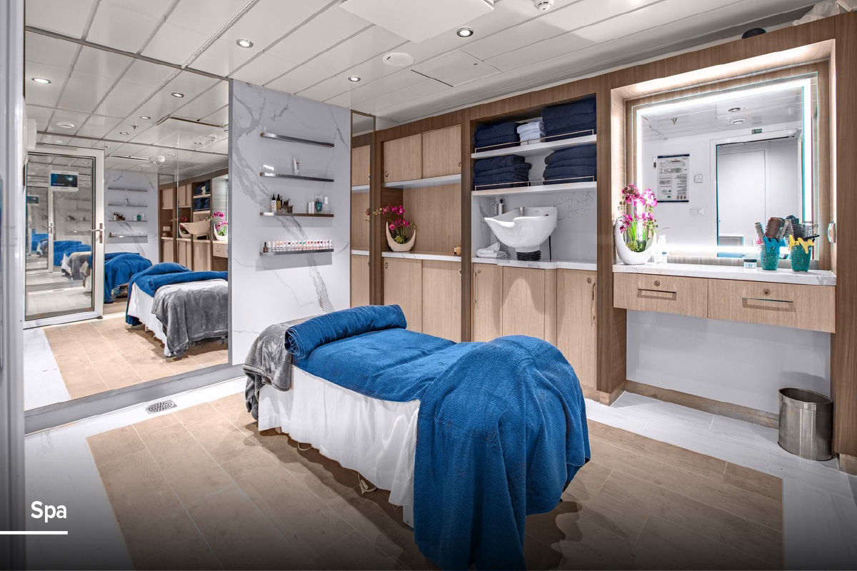 Unwind with destination-inspired treatments that reflect the spirit of the regions we explore—an inviting sanctuary for relaxation, renewal, and a deeper sense of well-being at sea.